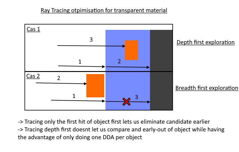 Une des raisons pour laquelle cette solution peut avoir des effets minimaux sur les perfs est qu’une partie de la logique est deja existante et necessite juste une adaptation : la DDA fine se fait sur un bitmask de frontiere solide/airla DDA tuile 8x8x8 est juste générée sur ce bitmask ( c’est meme mieux car ce sont des matrices booléene et pas 8bits )la seule logique réellement ajoutée est l’evaluation finale de la SDF et la recherche du materiaux. Le degrés combinatoire est beaucoup plus faible que pour un fillet