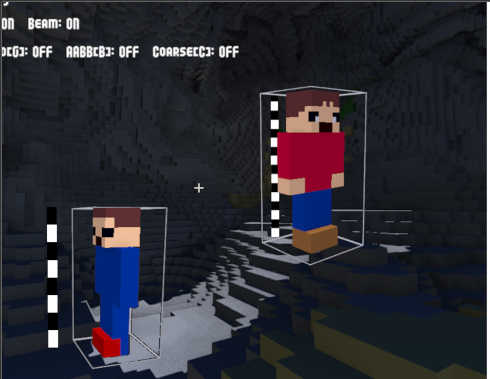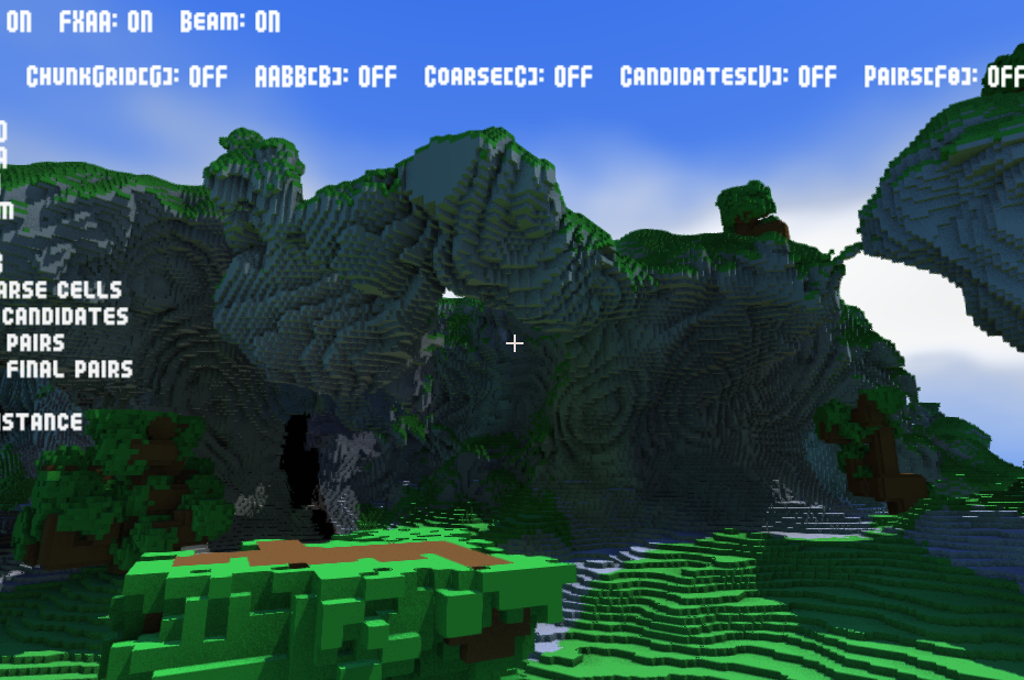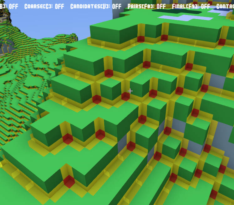 une premiere collision est effectuée entre les fragment 8x8x8 de voxel plein ou vides. les fragments pleins de l’objet A penetrant des fragments pleins de l’objet B forment des paires. On test ensuite les collision à echelle voxel, à l’interieur de ces pairesEssaie d’optimisation des structures coté CPU ( notamment les nouveaux fragments / fragments binary )